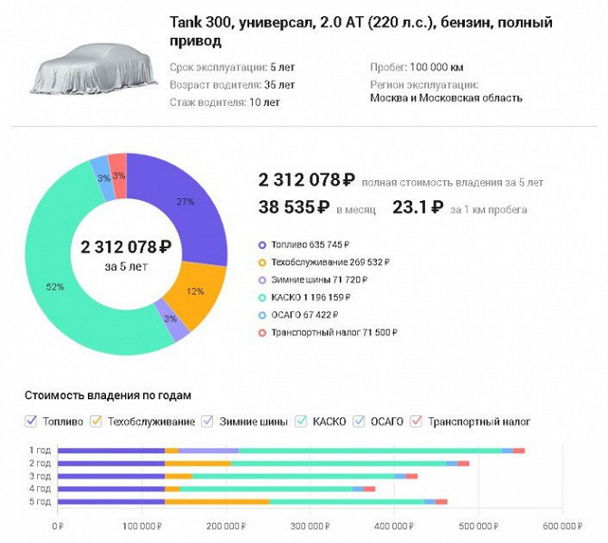 Изображение: Tank Больше всего придется потратить на КАСКО — 1,2 млн рублей. На втором месте по объёму затрат — топливо: на это за пять лет уйдёт ещё 635,7 тыс. рублей. За техобслуживание машины придётся отдать 269,5 тыс. рублей. На этом фоне траты на транспортный налог, зимние шины и ОСАГО выглядят совсем небольшими — около 210 тыс. рублей в сумме.